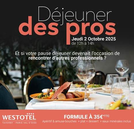 Le WESTOTEL de Taverny organise la 1ère édition du « Déjeuner des Pros », qui se tiendra le jeudi 2 octobre. L’objectif ? Réunir les professionnels de Taverny, St-Ouen l’Aumône, Beauchamp, Franconville, Frépillon et Herblay, pour échanger, développer votre visibilité et booster votre réseau.