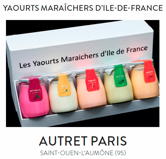 Le yaourt revisité par Autret Paris joue la carte de la différence avec les premiers yaourts aux légumes d’Île-de-France. Élaborés à partir de produits 100% franciliens, du maraîcher Laurent Berrurier à Neuville sur Oise, ils se consomment aussi bien en entrée qu’en dessert. La texture sans morceaux et les 5 parfums originaux (petit pois & menthe, panais & amande, betterave & framboise, tomate & fraises, carotte & yuzu), se prêtent à de multiples usages : en sauce froide pour des crudités, en remplacement de crème fraîche, pour les milk shakes… Ce produit étonnant a été sélectionné pour concourir dans la catégorie « Art Culinaire Gastronomie. » Le concept, qui ont demandé beaucoup d’essai avant d’obtenir la texture finale, devrait être très prochainement commercialisé.
