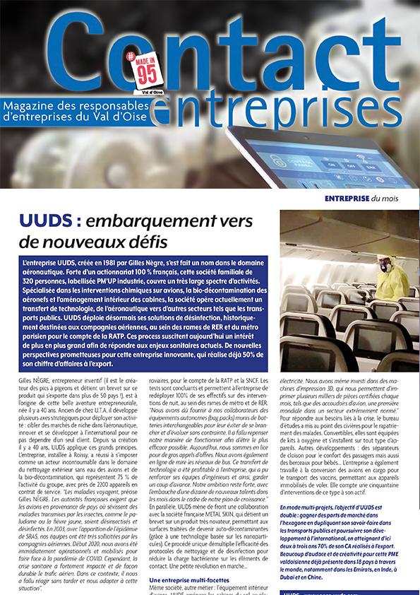 Alors que l’Etat mise sur la relance industrielle pour faire repartir l’économie, Contact Entreprises a consacré son dernier numéro aux entreprises qui investissent, avec un portrait à l’entreprise UUDS, créée en 1981 par Gilles Nègre, qui s’est fait un nom dans le domaine aéronautique. Forte d’un actionnariat 100 % français, cette société familiale de 320 personnes, labellisée PM’UP industrie, couvre un très large spectre d’activités. Spécialisée dans les interventions chimiques sur avions, la bio-décontamination des aéronefs et l’aménagement intérieur des cabines, la société opère actuellement un transfert de technologie, de l’aéronautique vers d’autres secteurs tels que les transports publics. UUDS déploie désormais ses solutions de désinfection, historiquement destinées aux compagnies aériennes, au sein des rames de RER et du métro parisien pour le compte de la RATP. De nouvelles perspectives prometteuses pour cette entreprise innovante, qui réalise déjà 50% de son chiffre d’affaires à l’export.