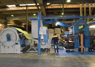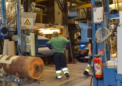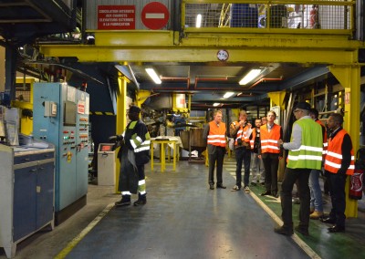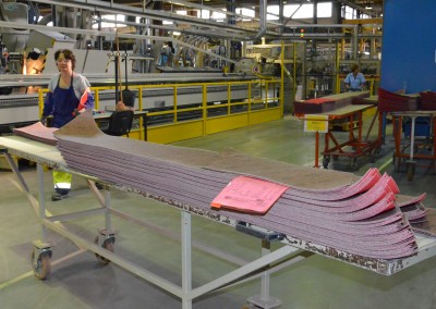 Le directeur général a ensuite conduit participants pour la visite de l’usine, qui fait travailler 165 personnes, et a permis de découvrir les techniques de fabrication complexes des abrasifs, destinés essentiellement à des applications industrielles : le site reçoit d’énormes bobines de toiles (coton ou polyester), traitées et recouvertes d’une première couche de résine puis de grains d’abrasifs. L’apprêtage et le liant sont appliqués en passant dans un « maker », une grosse machine composée d’impressionnants rouleaux. Après une première cuisson, une nouvelle couche de résine est passée pour assurer l’ancrage final des grains sur le support, avant un nouveau passage dans les fours. La « conversion » constitue ensuite la seconde étape de production : les bobines sont découpées à façon sur des lignes automatisées ou manuelles pour les clients. Une autre unité est destinée à la fabrication de disques. L’usine, engagée dans des efforts continus en matière de sécurité, poursuit ses investissements et va très prochainement faire l’acquisition d’une presse de découpe laser, la première de ce type à faire son entrée sur le site.